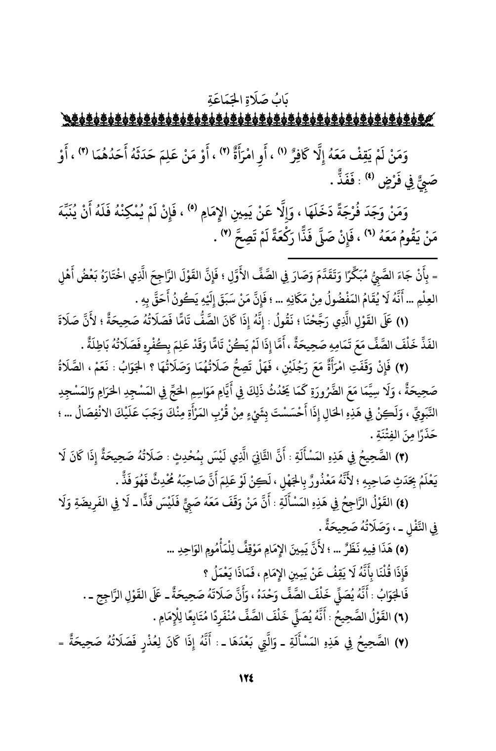 (¬7) الصحيح في هذه المسألة - والتي بعدها -: أنه إذا كان لعذرٍ فصلاته صحيحةٌ مطلقًا، والعذر: تمام الصف.