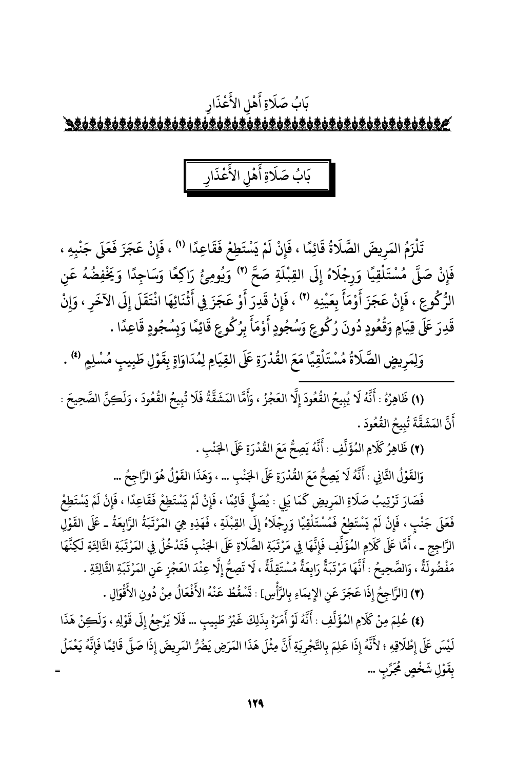 فصار ترتيب صلاة المريض كما يلي: يصلي قائمًا، فإن لم يستطع فقاعدًا، فإن لم يستطع فعلى جنبٍ، فإن لم يستطع فمستلقيًا ورجلاه إلى القبلة، فهذه هي المرتبة الرابعة - على القول الراجح -، أما على كلام المؤلف فإنها في مرتبة الصلاة على الجنب فتدخل في المرتبة الثالثة لكنها مفضولةٌ، والصحيح: أنها مرتبةٌ رابعةٌ مستقلةٌ، لا تصح إلا عند العجز عن المرتبة الثالثة.
