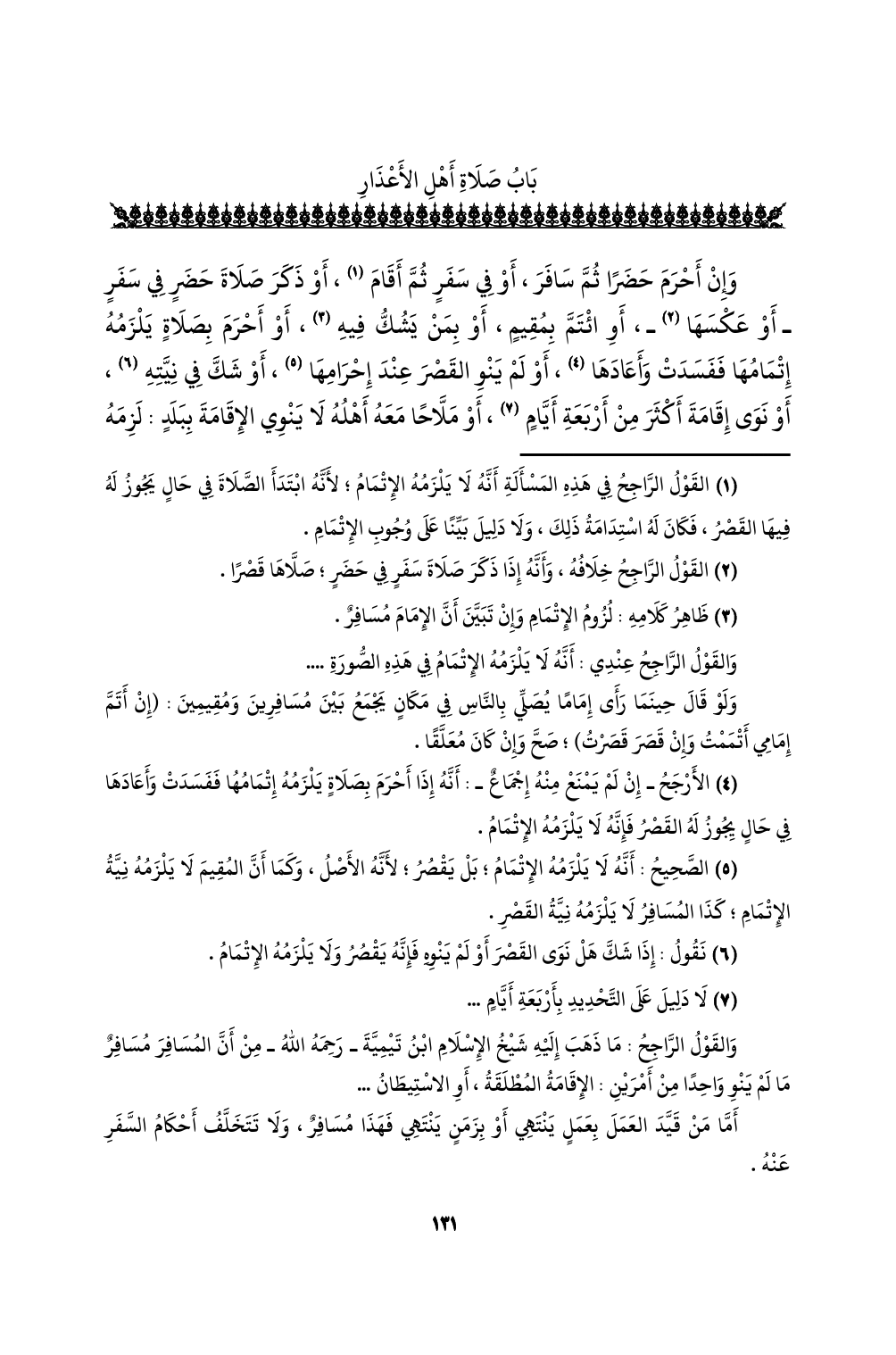 (¬5) الصحيح: أنه لا يلزمه الإتمام؛ بل يقصر؛ لأنه الأصل، وكما أن المقيم لا يلزمه نية الإتمام؛ كذا المسافر لا يلزمه نية القصر.