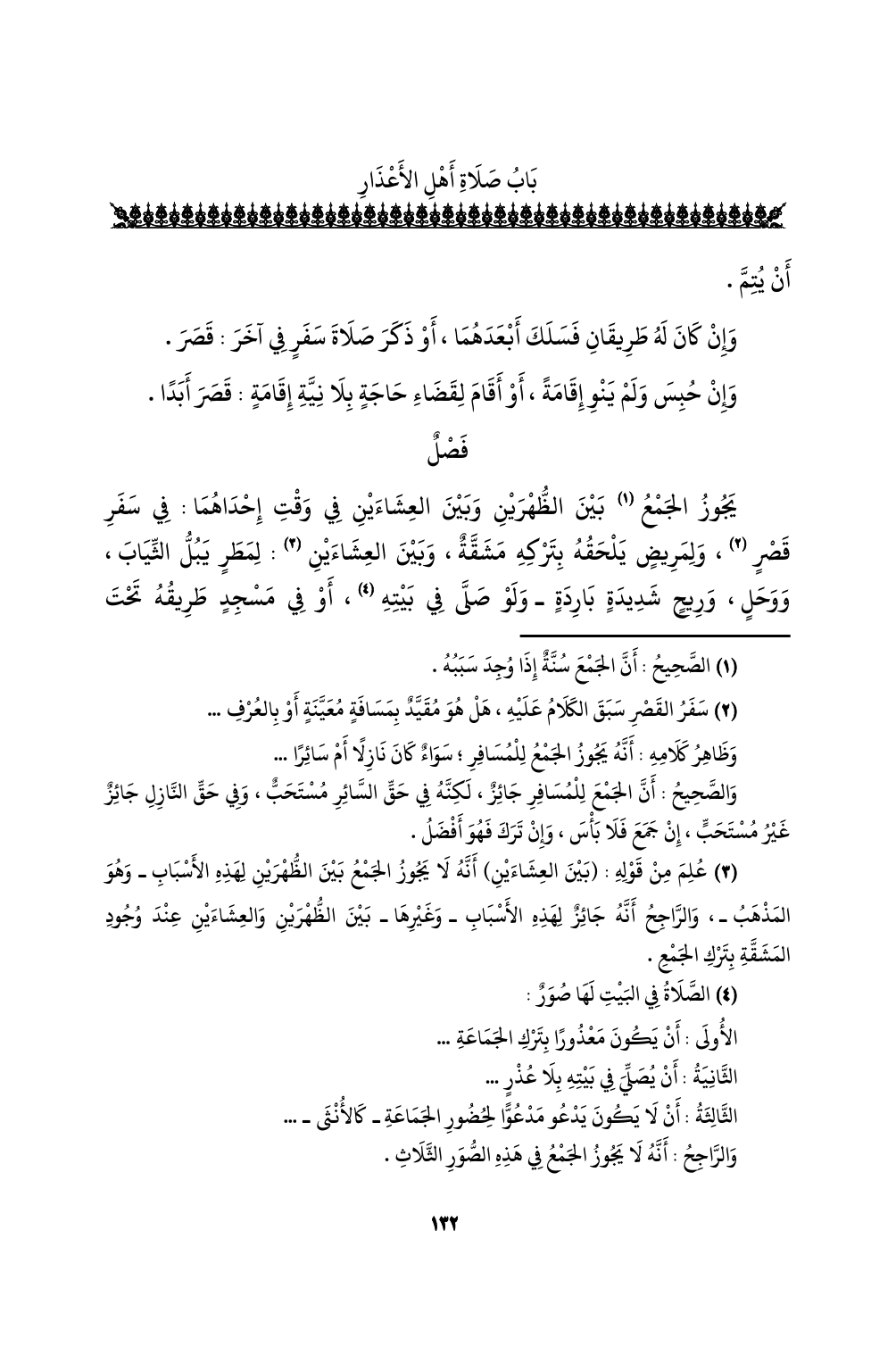 (¬3) علم من قوله: (بين العشاءين) أنه لا يجوز الجمع بين الظهرين لهذه الأسباب - وهو المذهب -، والراجح أنه جائزٌ لهذه الأسباب - وغيرها - بين الظهرين والعشاءين عند وجود المشقة بترك الجمع.