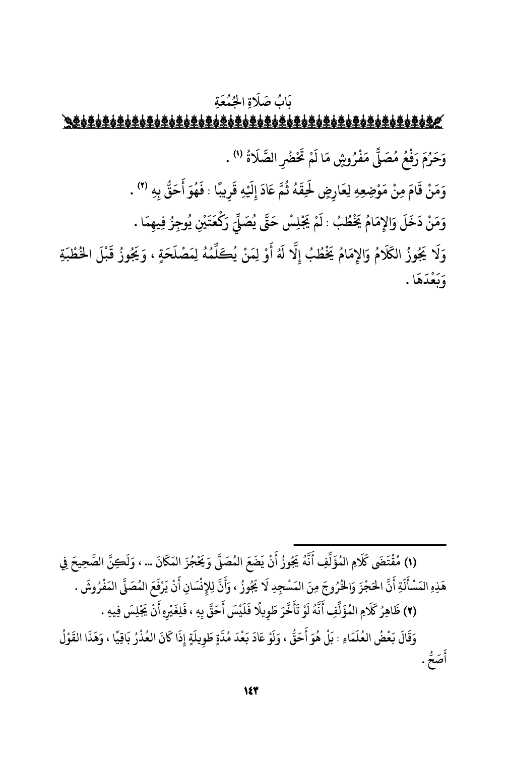 (¬1) مقتضى كلام المؤلف أنه يجوز أن يضع المصلى ويحجز المكان ... ، ولكن الصحيح في هذه المسألة أن الحجز والخروج من المسجد لا يجوز، وأن للإنسان أن يرفع المصلى المفروش.