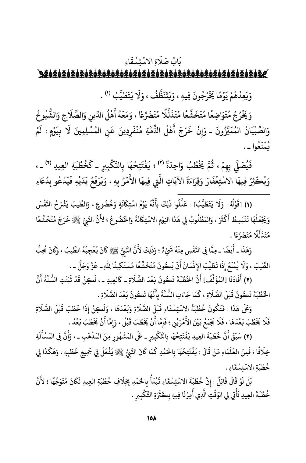 (¬3) سبق أن خطبة العيد يفتتحها بالتكبير - على المشهور من المذهب -، وأن في المسألة خلافًا؛ فمن العلماء من قال: يفتتحها بالحمد كما كان النبي صلى الله عليه وسلم يفعل في جميع خطبه، وهكذا في خطبة الاستسقاء.