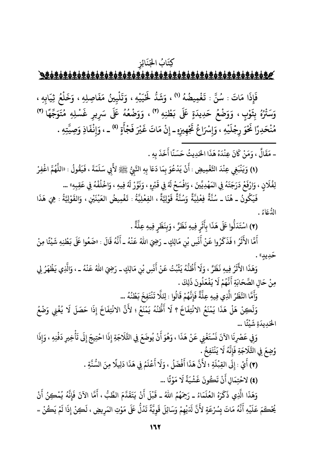 وفي عصرنا الآن نستغني عن هذا، وهو أن يوضع في الثلاجة إذا احتيج إلى تأخير دفنه، وإذا وضع في الثلاجة فإنه لا ينتفخ.