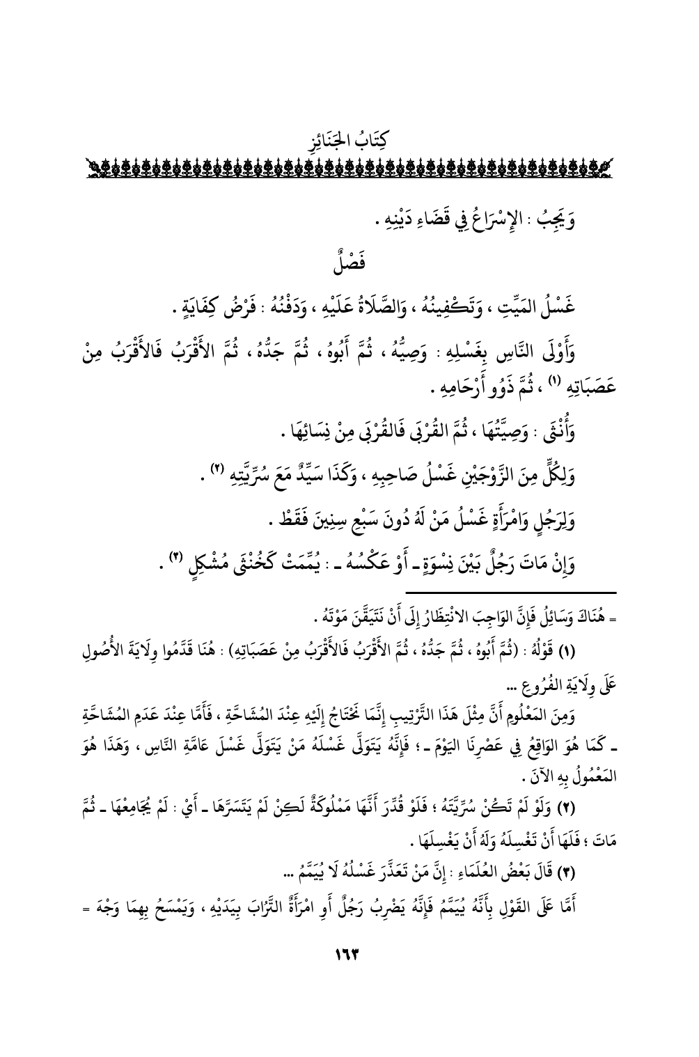 ومن المعلوم أن مثل هذا الترتيب إنما نحتاج إليه عند المشاحة، فأما عند عدم المشاحة - كما هو الواقع في عصرنا اليوم -؛ فإنه يتولى غسله من يتولى غسل عامة الناس، وهذا هو المعمول به الآن.