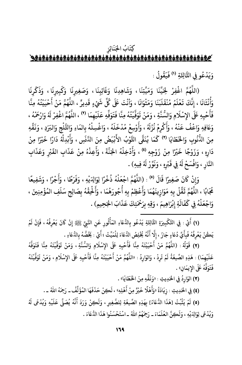 (¬5) لم يثبت [هذا الدعاء] بهذه الصيغة للصغير، ولكن ورد أنه يصلى عليه ويدعى له ويدعى لوالديه، ولكن العلماء - رحمهم الله - استحسنوا هذا الدعاء.