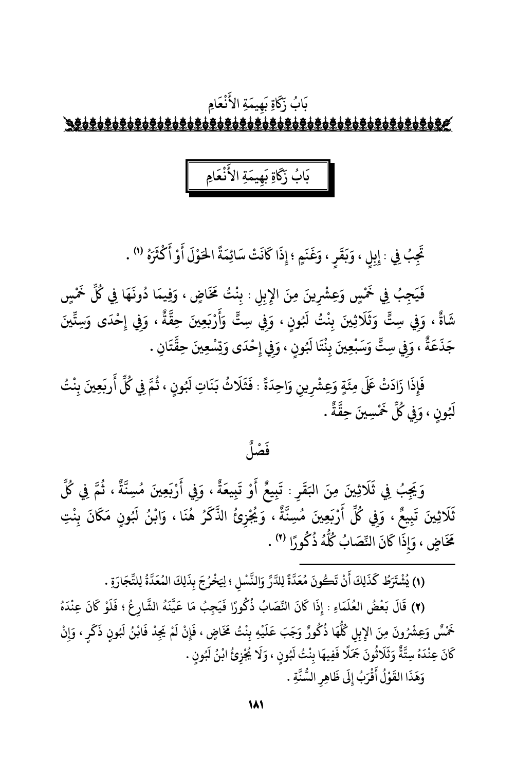 فيجب في خمسٍ وعشرين من الإبل: بنت مخاضٍ، وفيما دونها في كل خمسٍ شاةٌ، وفي ست وثلاثين بنت لبونٍ، وفي ست وأربعين حقةٌ، وفي إحدى وستين جذعةٌ، وفي ست وسبعين بنتا لبونٍ، وفي إحدى وتسعين حقتان.