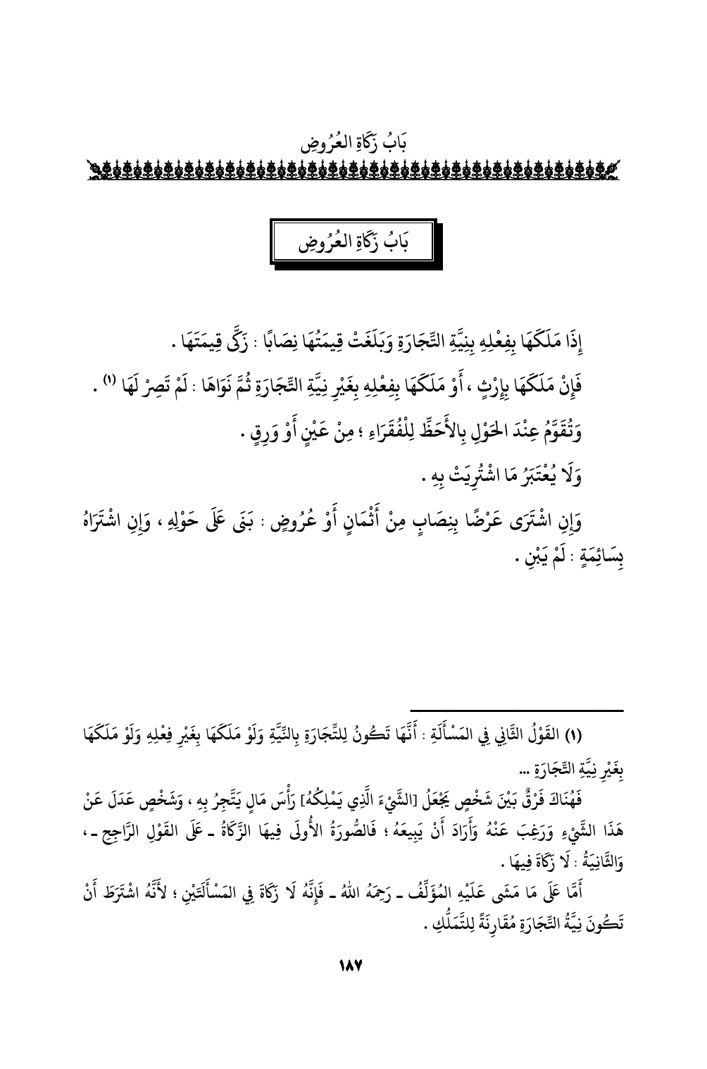 (¬1) القول الثاني في المسألة: أنها تكون للتجارة بالنية ولو ملكها بغير فعله ولو ملكها بغير نية التجارة ...