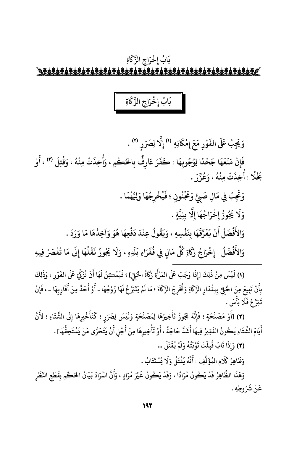 (¬2) [أو مصلحةٍ؛ فإنه يجوز تأخيرها لمصلحةٍ وليس لضررٍ؛ كتأخيرها إلى الشتاء؛ لأن أيام الشتاء يكون الفقير فيها أشد حاجةً، أو تأخيرها من أجل أن يتحرى من يستحقها].