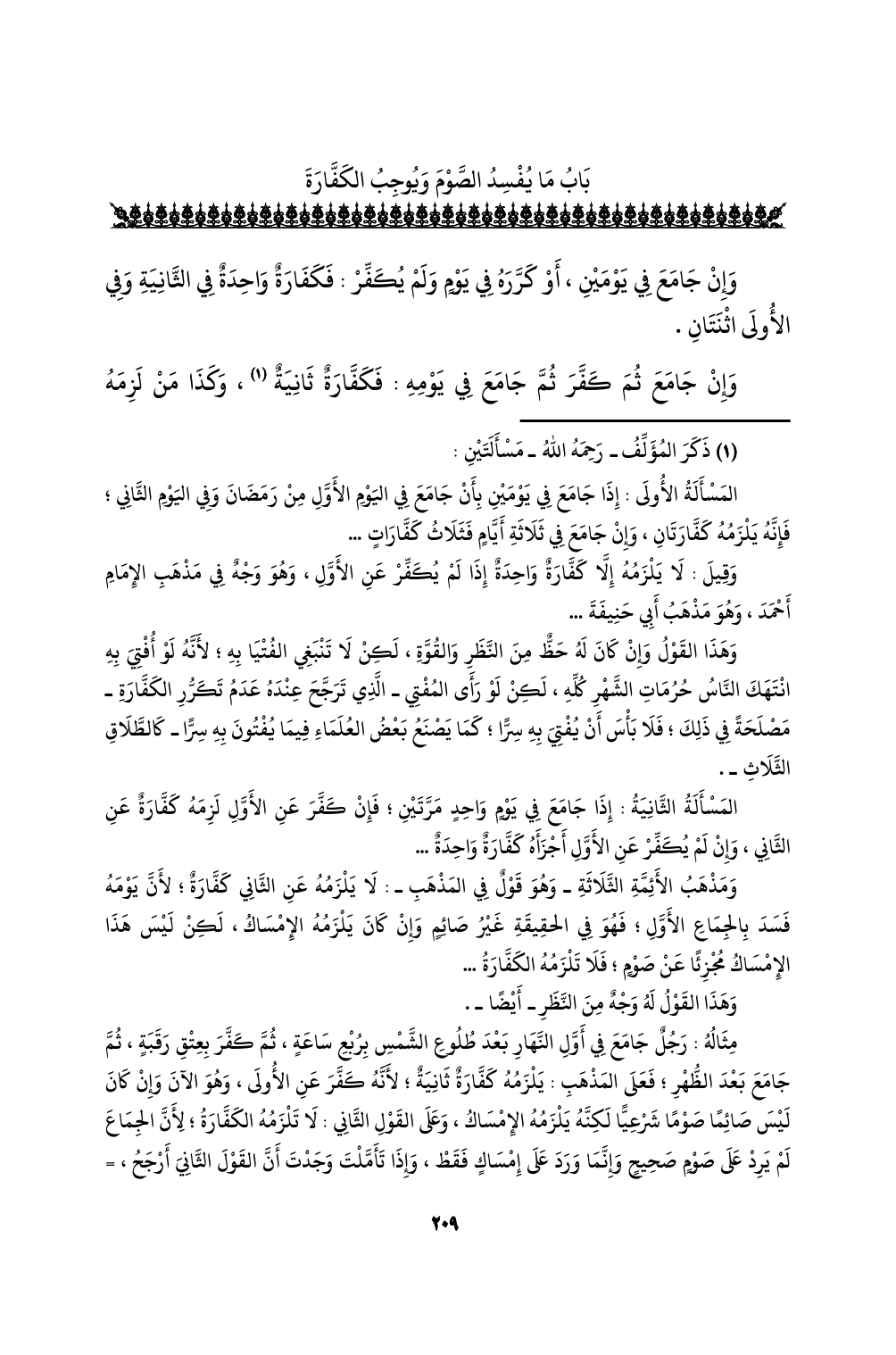 مثاله: رجلٌ جامع في أول النهار بعد طلوع الشمس بربع ساعةٍ، ثم كفر بعتق رقبةٍ، ثم جامع بعد الظهر؛ فعلى المذهب: يلزمه كفارةٌ ثانيةٌ؛ لأنه كفر عن الأولى، وهو الآن وإن كان ليس صائمًا صومًا شرعيا لكنه يلزمه الإمساك، وعلى القول الثاني: لا تلزمه الكفارة؛ لأن الجماع لم يرد على صومٍ صحيحٍ وإنما ورد على إمساكٍ فقط، وإذا تأملت وجدت أن القول الثاني أرجح، وأنه لا يلزمه بعد أن أفسد صومه كفارةٌ.