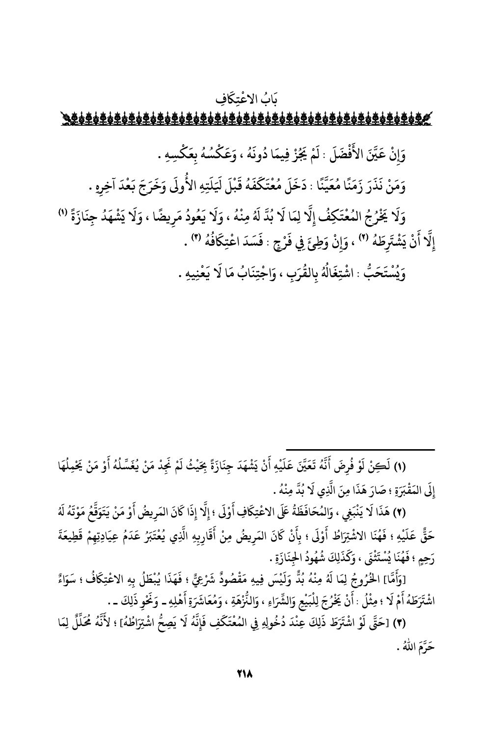 (¬3) [حتى لو اشترط ذلك عند دخوله في المعتكف فإنه لا يصح اشتراطه]؛ لأنه محللٌ لما حرم الله.