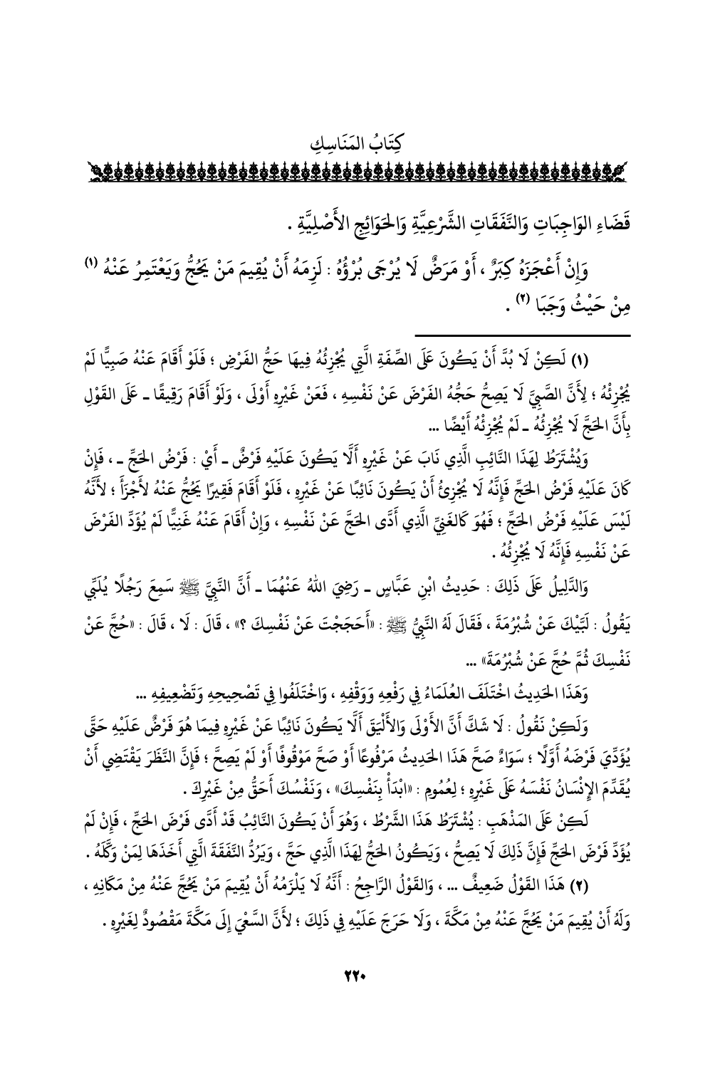(¬1) لكن لا بد أن يكون على الصفة التي يجزئه فيها حج الفرض؛ فلو أقام عنه صبيا لم يجزئه؛ لأن الصبي لا يصح حجه الفرض عن نفسه، فعن غيره أولى، ولو أقام رقيقًا - على القول بأن الحج لا يجزئه - لم يجزئه أيضًا ...