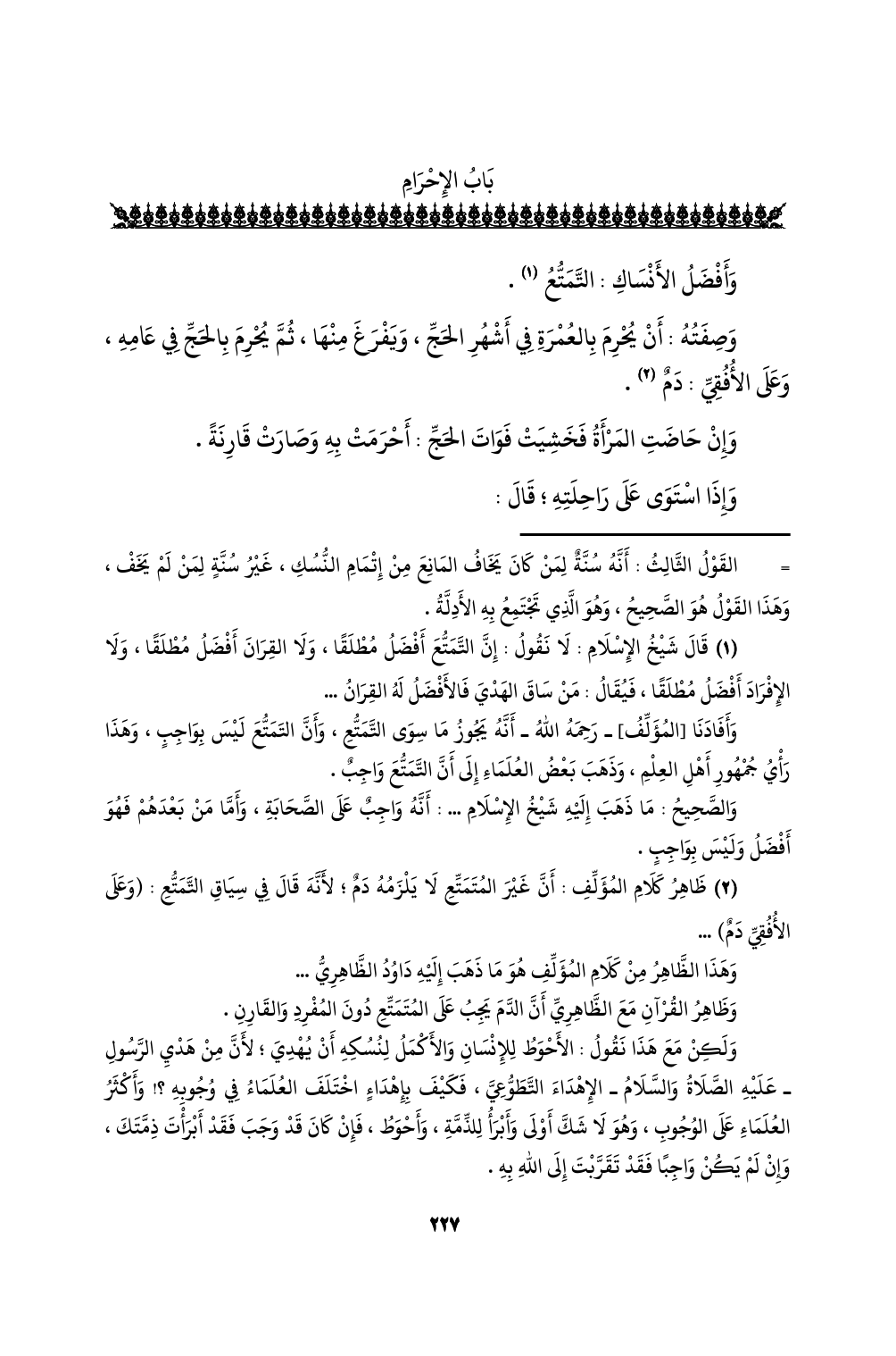 (¬1) قال شيخ الإسلام: لا نقول: إن التمتع أفضل مطلقًا، ولا القران أفضل مطلقًا، ولا الإفراد أفضل مطلقًا، فيقال: من ساق الهدي فالأفضل له القران ...