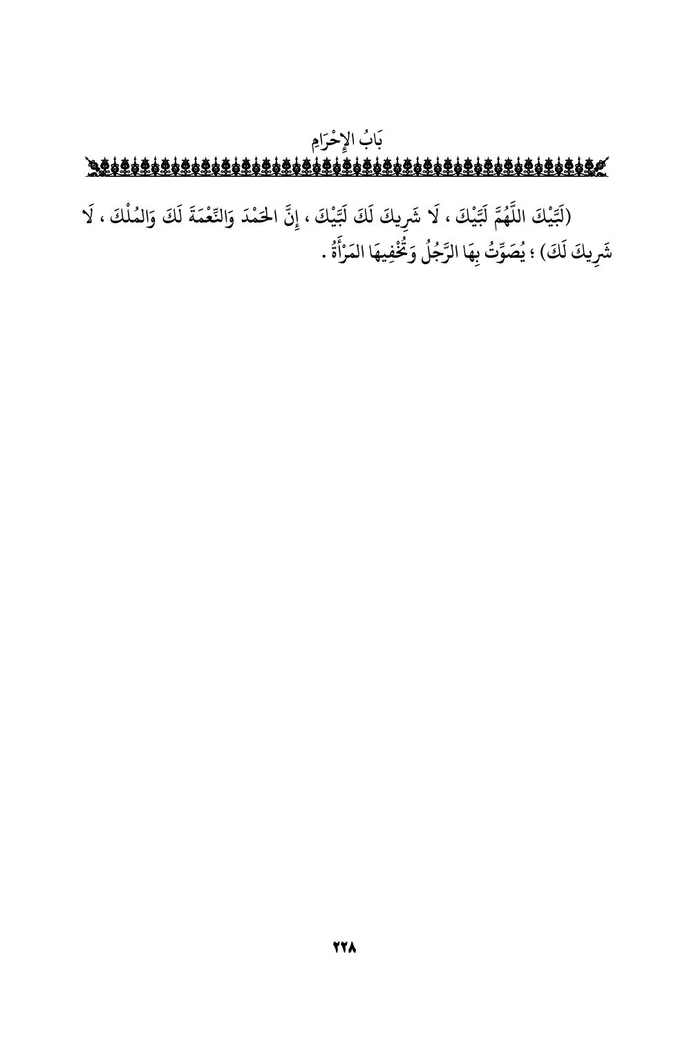 (لبيك اللهم لبيك، لا شريك لك لبيك، إن الحمد والنعمة لك والملك، لا شريك لك)؛ يصوت بها الرجل وتخفيها المرأة.