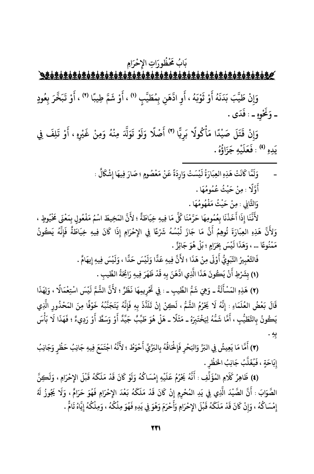 (¬2) هذه المسألة - وهي شم الطيب -: في تحريمها نظرٌ؛ لأن الشم ليس استعمالًا، ولهذا قال بعض العلماء: إنه لا يحرم الشم، لكن إن تلذذ به فإنه يتجنبه خوفًا من المحذور الذي يكون بالتطيب، أما شمه ليختبره - مثلًا - هل هو طيبٌ جيدٌ أو وسطٌ أو رديءٌ؛ فهذا لا بأس به.