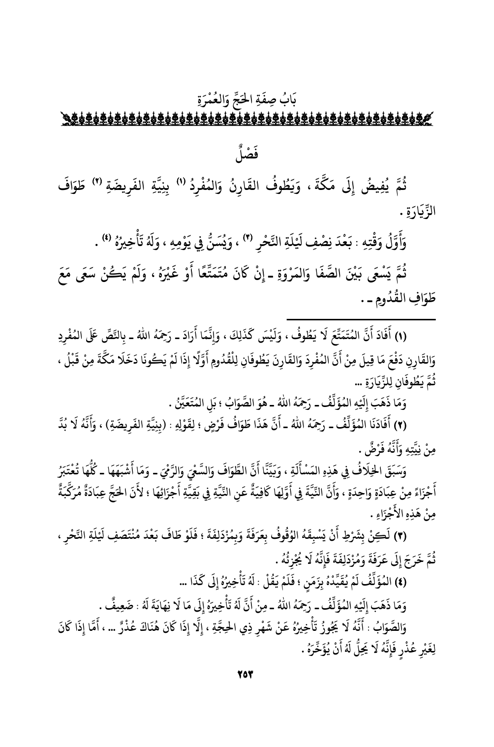 (¬1) أفاد أن المتمتع لا يطوف، وليس كذلك، وإنما أراد - رحمه الله - بالنص على المفرد والقارن دفع ما قيل من أن المفرد والقارن يطوفان للقدوم أولًا إذا لم يكونا دخلا مكة من قبل، ثم يطوفان للزيارة ...