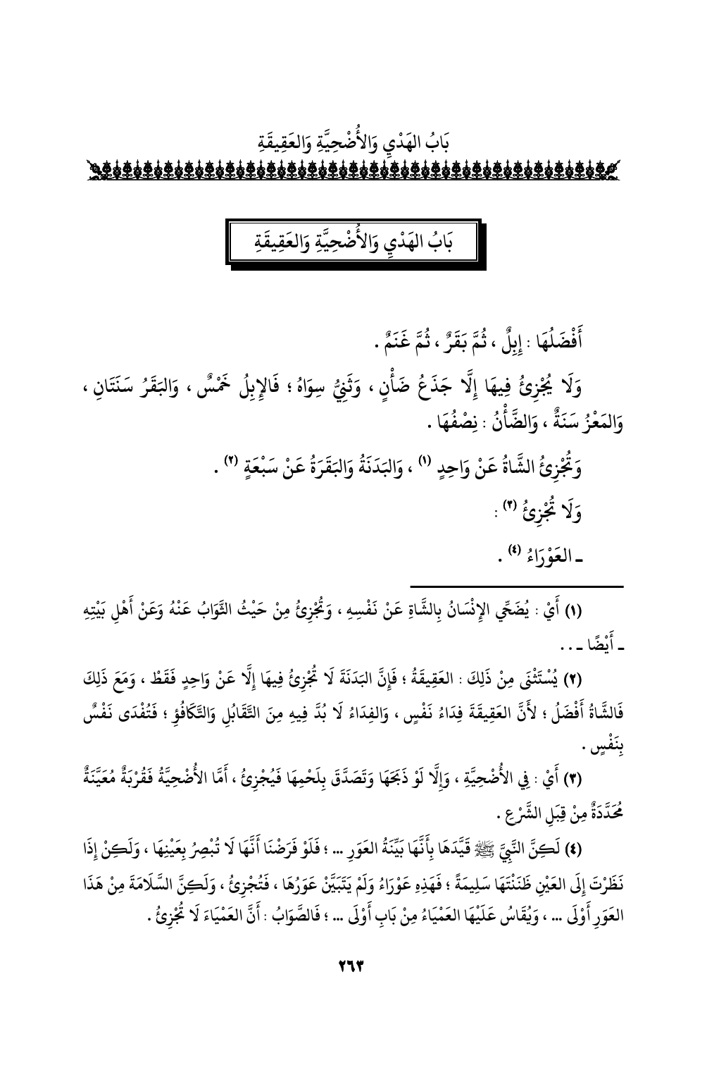 (¬2) يستثنى من ذلك: العقيقة؛ فإن البدنة لا تجزئ فيها إلا عن واحدٍ فقط، ومع ذلك فالشاة أفضل؛ لأن العقيقة فداء نفسٍ، والفداء لا بد فيه من التقابل والتكافؤ؛ فتفدى نفسٌ بنفسٍ.
