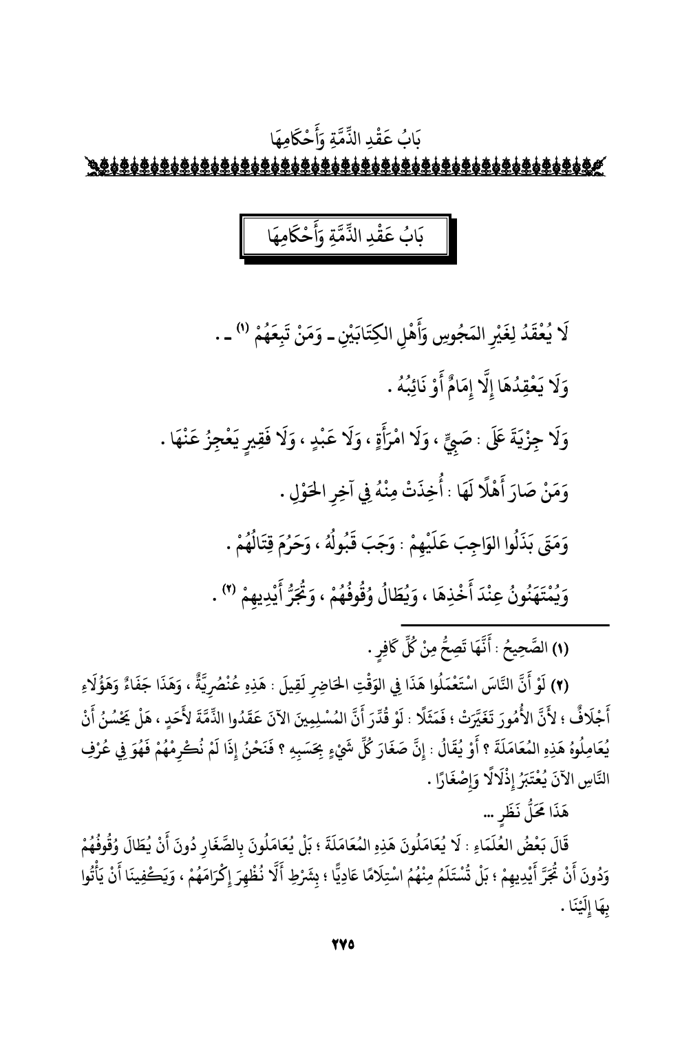 (¬2) لو أن الناس استعملوا هذا في الوقت الحاضر لقيل: هذه عنصريةٌ، وهذا جفاءٌ وهؤلاء أجلافٌ؛ لأن الأمور تغيرت؛ فمثلًا: لو قدر أن المسلمين الآن عقدوا الذمة لأحدٍ، هل يحسن أن يعاملوه هذه المعاملة؟ أو يقال: إن صغار كل شيءٍ بحسبه؟ فنحن إذا لم نكرمهم فهو في عرف الناس الآن يعتبر إذلالًا وإصغارًا.
