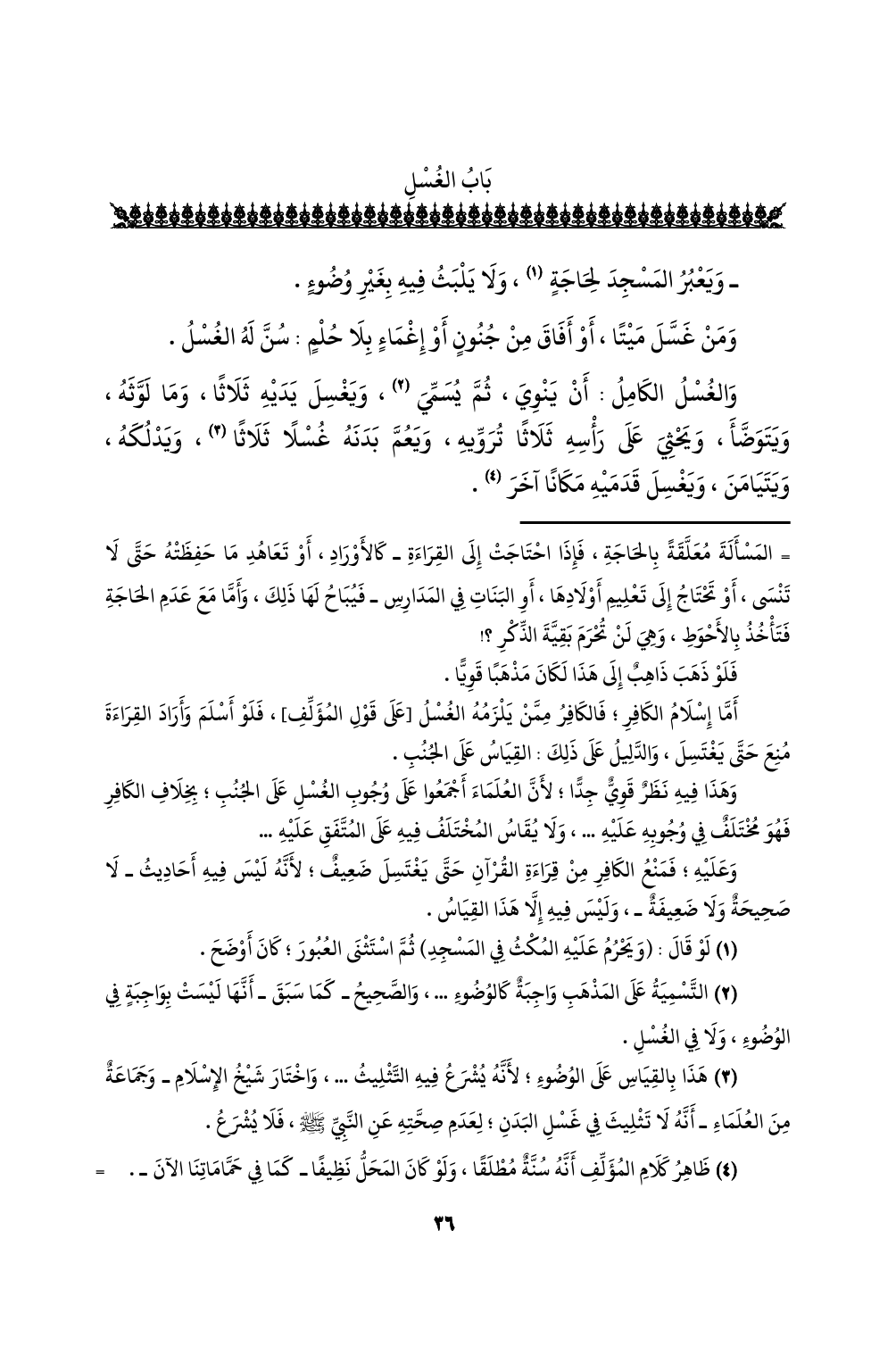 (¬4) ظاهر كلام المؤلف أنه سنةٌ مطلقًا، ولو كان المحل نظيفًا - كما في حماماتنا الآن -. والظاهر لي: أنه يغسل قدميه في مكانٍ آخر عند الحاجة - كما لو كانت الأرض طينًا -.