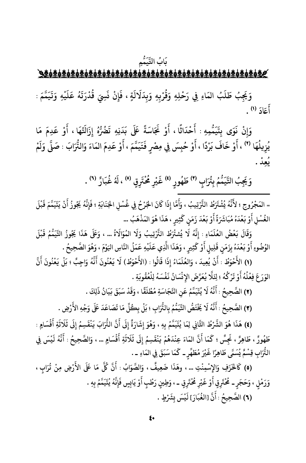 (¬4) هذا هو الشرط الثاني لما يتيمم به، وهو إشارةٌ إلى أن التراب ينقسم إلى ثلاثة أقسامٍ: طهورٌ، طاهرٌ، نجسٌ؛ كما أن الماء عندهم ينقسم إلى ثلاثة أقسامٍ ... ، والصحيح: أنه ليس في التراب قسمٌ يسمى طاهرًا غير مطهرٍ - كما سبق في الماء -.
