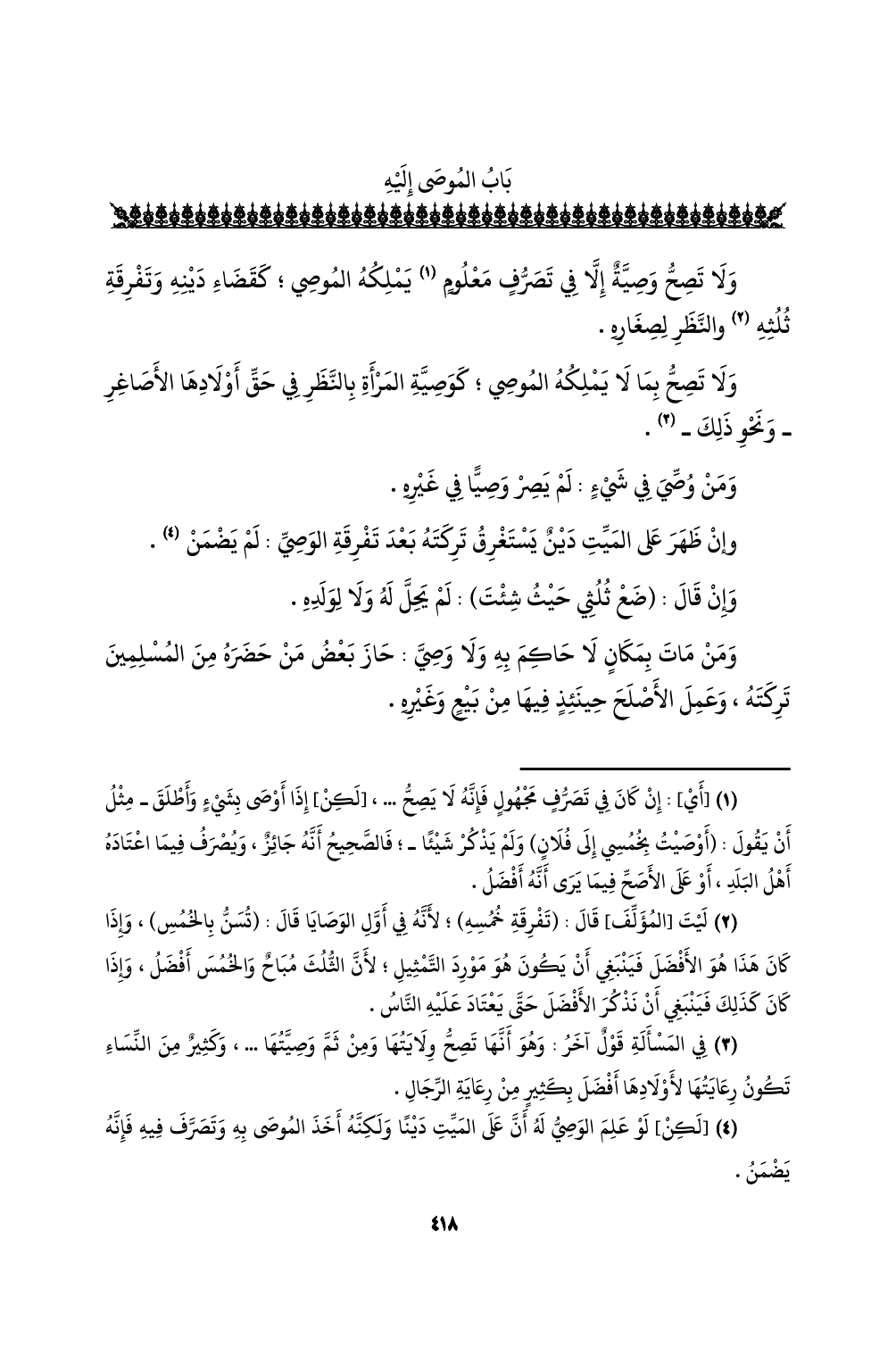 (¬1) [أي]: إن كان في تصرفٍ مجهولٍ فإنه لا يصح ... ، [لكن] إذا أوصى بشيءٍ وأطلق - مثل أن يقول: (أوصيت بخمسي إلى فلانٍ) ولم يذكر شيئًا -؛ فالصحيح أنه جائزٌ، ويصرف فيما اعتاده أهل البلد، أو على الأصح فيما يرى أنه أفضل.