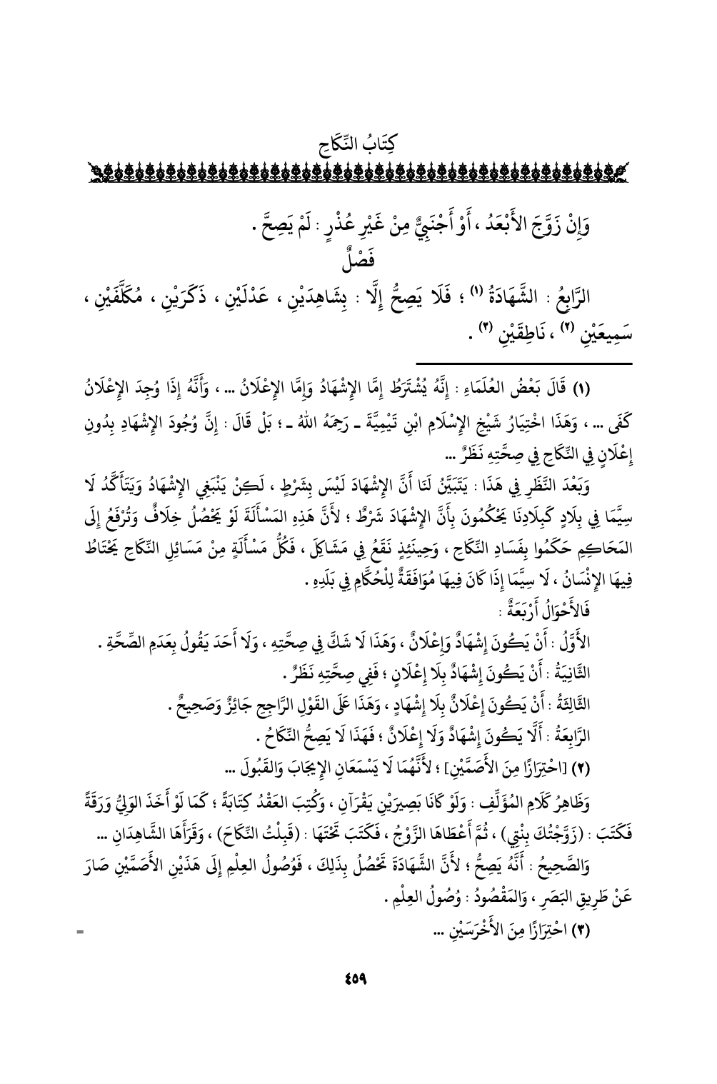 (¬1) قال بعض العلماء: إنه يشترط إما الإشهاد وإما الإعلان ... ، وأنه إذا وجد الإعلان كفى ... ، وهذا اختيار شيخ الإسلام ابن تيمية - رحمه الله -؛ بل قال: إن وجود الإشهاد بدون إعلانٍ في النكاح في صحته نظرٌ ...