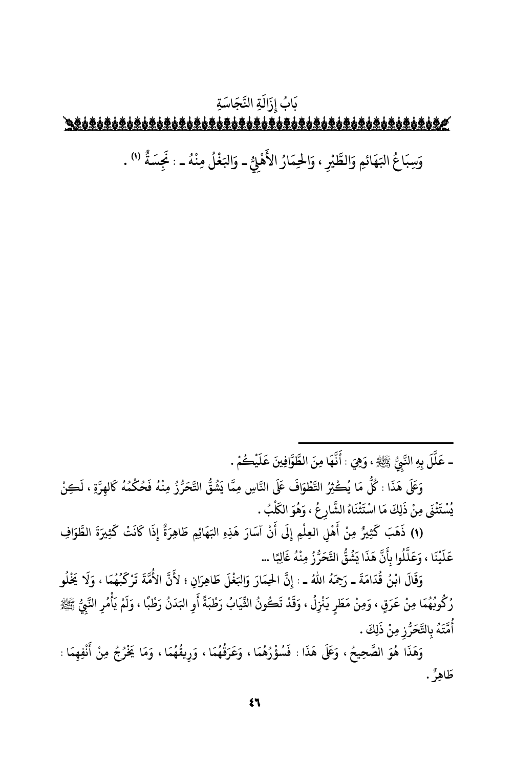 (¬1) ذهب كثيرٌ من أهل العلم إلى أن آسار هذه البهائم طاهرةٌ إذا كانت كثيرة الطواف علينا، وعللوا بأن هذا يشق التحرز منه غالبًا ...