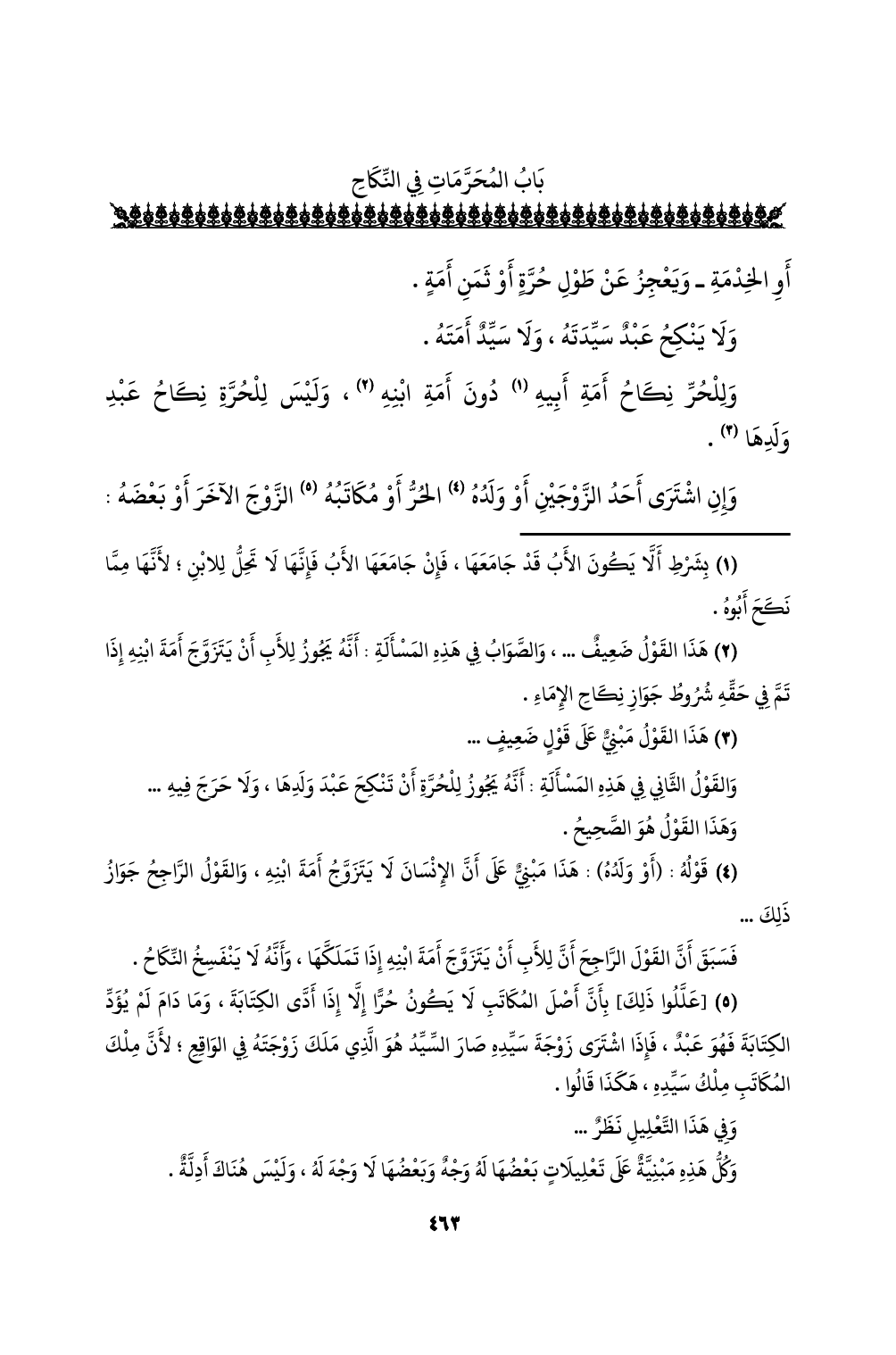 (¬5) [عللوا ذلك] بأن أصل المكاتب لا يكون حرا إلا إذا أدى الكتابة، وما دام لم يؤد الكتابة فهو عبدٌ، فإذا اشترى زوجة سيده صار السيد هو الذي ملك زوجته في الواقع؛ لأن ملك المكاتب ملك سيده، هكذا قالوا.