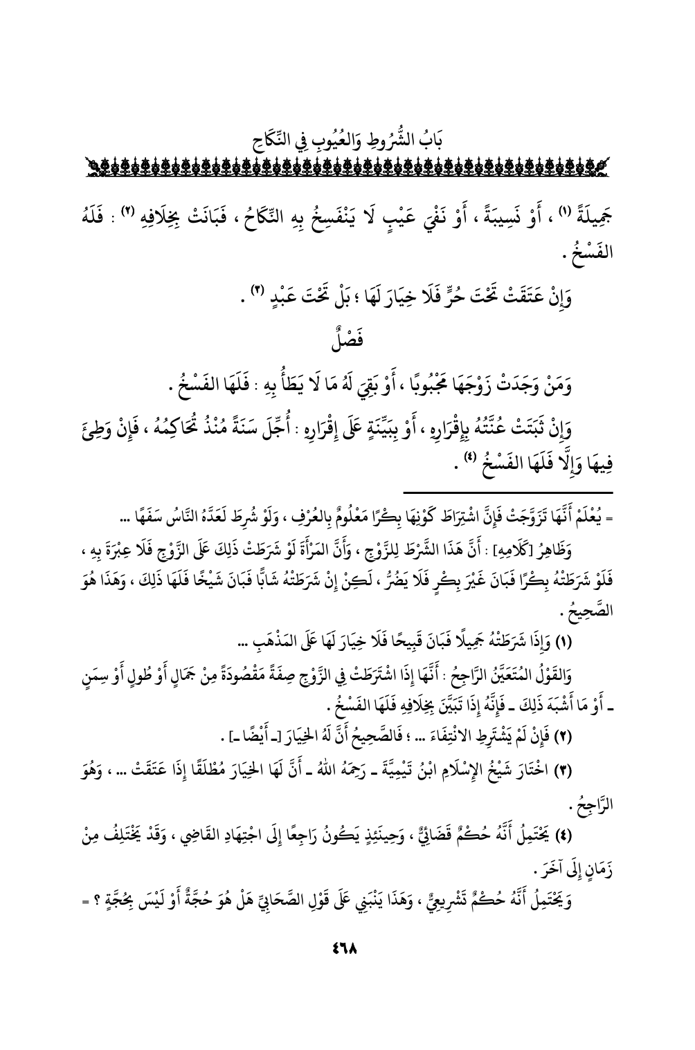 (¬1) وإذا شرطته جميلًا فبان قبيحًا فلا خيار لها على المذهب ...