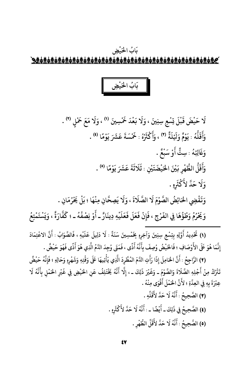 (¬1) تحديد أوله بتسع سنين وآخره بخمسين سنةً: لا دليل عليه، فالصواب: أن الاعتماد إنما هو على الأوصاف؛ فالحيض وصف بأنه أذًى، فمتى وجد الدم الذي هو أذًى فهو حيضٌ.