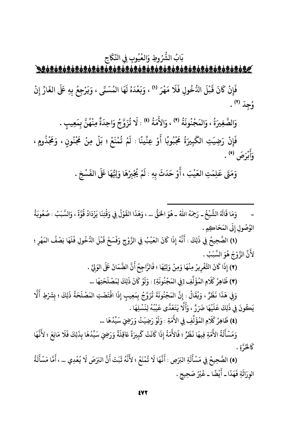 (¬5) الصحيح في مسألة البرص: أنها لا تمنع؛ لأنه ثبت أن البرص لا يعدي ... ، أما مسألة الوراثة فهذا - أيضًا - غير صحيحٍ.