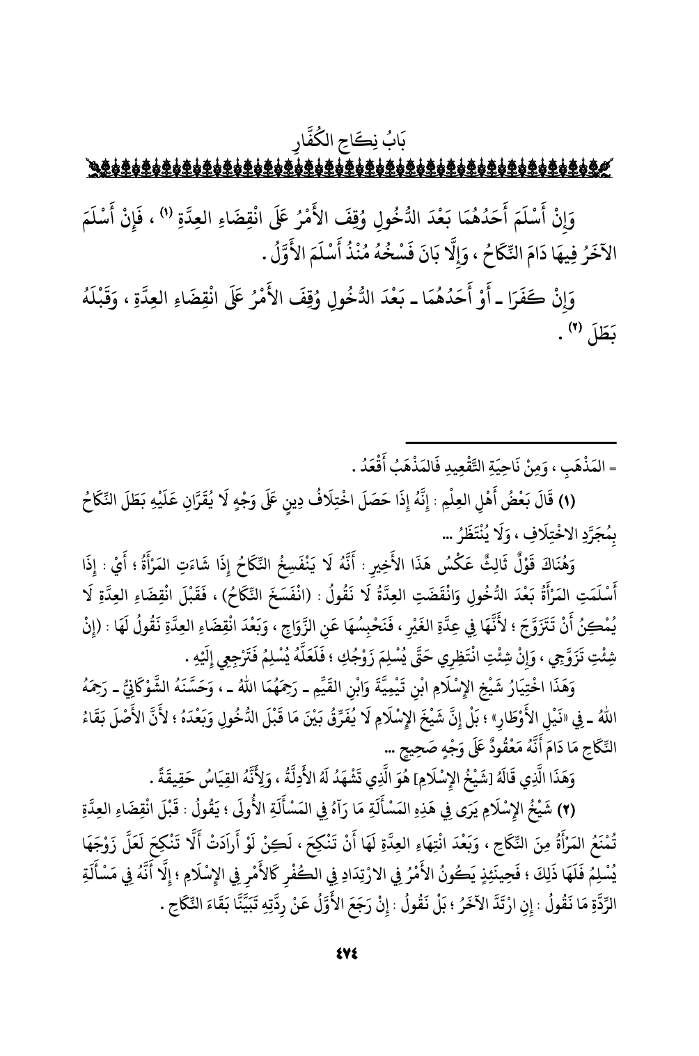(¬2) شيخ الإسلام يرى في هذه المسألة ما رآه في المسألة الأولى؛ يقول: قبل انقضاء العدة تمنع المرأة من النكاح، وبعد انتهاء العدة لها أن تنكح، لكن لو أرادت ألا تنكح لعل زوجها يسلم فلها ذلك؛ فحينئذٍ يكون الأمر في الارتداد في الكفر كالأمر في الإسلام؛ إلا أنه في مسألة الردة ما نقول: إن ارتد الآخر؛ بل نقول: إن رجع الأول عن ردته تبينا بقاء النكاح.