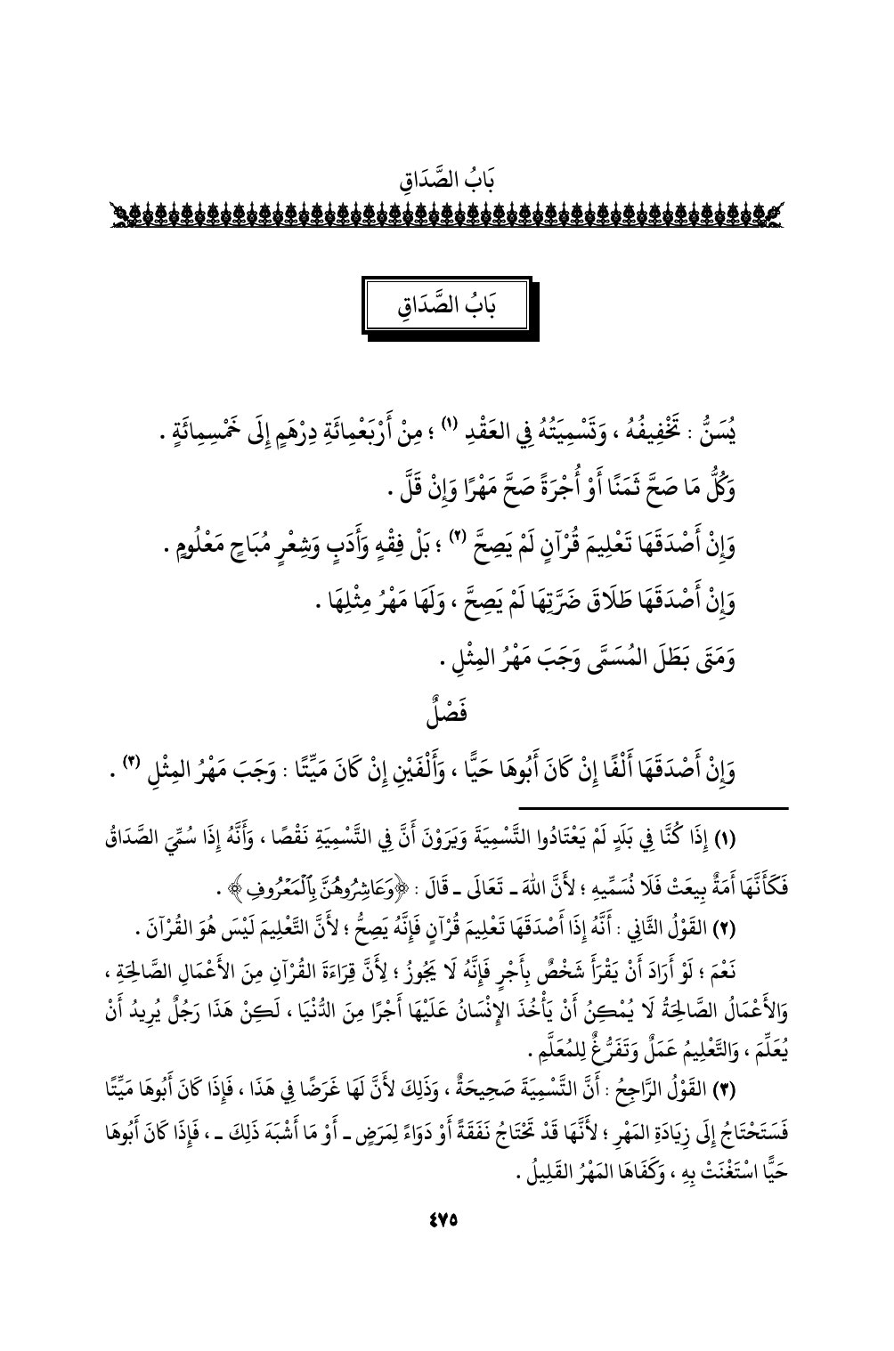 يسن: تخفيفه، وتسميته في العقد (¬1)؛ من أربعمائة درهمٍ إلى خمسمائةٍ.