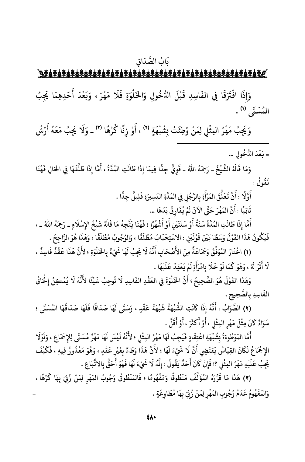 (¬2) الصواب: أنه إذا كانت الشبهة شبهة عقدٍ، وسمى لها صداقًا فلها صداقها المسمى؛ سواءٌ كان مثل مهر المثل، أو أكثر، أو أقل.
