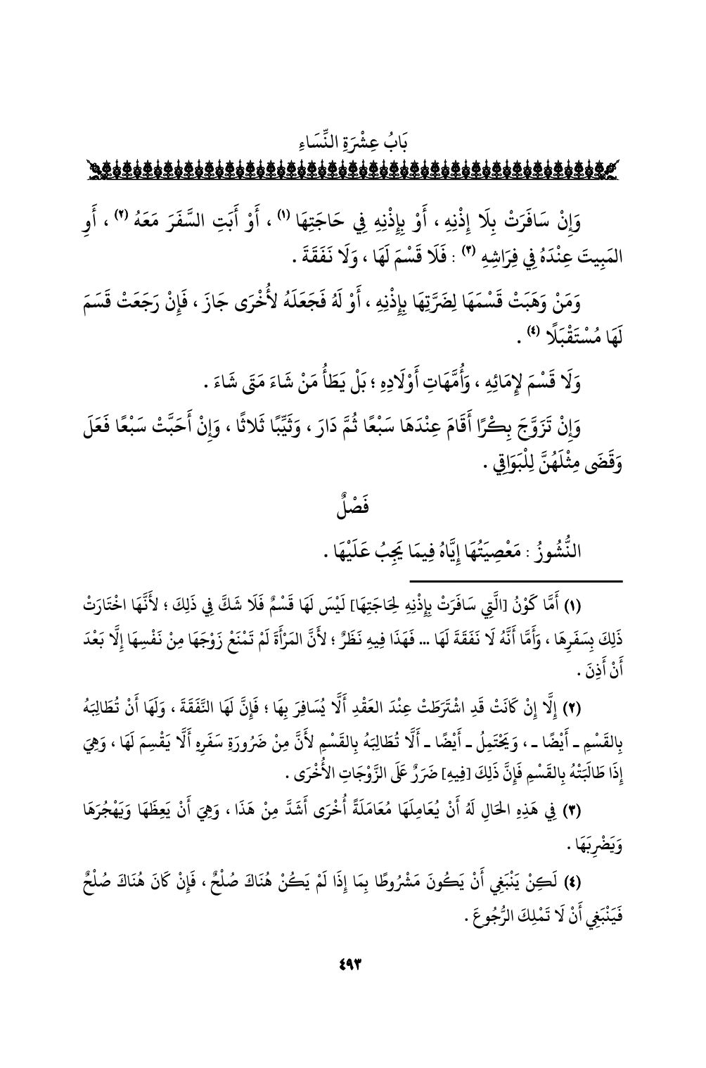 (¬2) إلا إن كانت قد اشترطت عند العقد ألا يسافر بها؛ فإن لها النفقة، ولها أن تطالبه بالقسم - أيضًا -، ويحتمل - أيضًا - ألا تطالبه بالقسم لأن من ضرورة سفره ألا يقسم لها، وهي إذا طالبته بالقسم فإن ذلك [فيه] ضررٌ على الزوجات الأخرى.