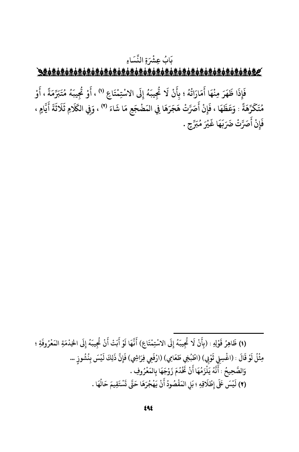(¬1) ظاهر قوله: (بأن لا تجيبه إلى الاستمتاع) أنها لو أبت أن تجيبه إلى الخدمة المعروفة؛ مثل لو قال: (اغسلي ثوبي) (اطبخي طعامي) (ارفعي فراشي) فإن ذلك ليس بنشوزٍ ...
