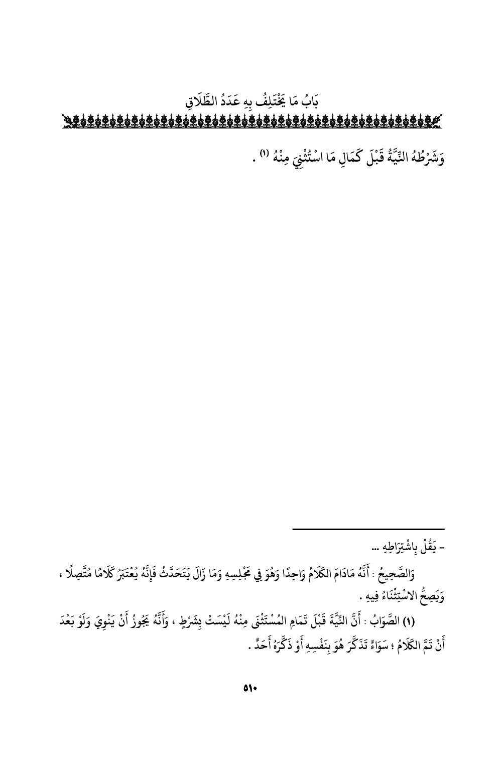 (¬1) الصواب: أن النية قبل تمام المستثنى منه ليست بشرطٍ، وأنه يجوز أن ينوي ولو بعد أن تم الكلام؛ سواءٌ تذكر هو بنفسه أو ذكره أحدٌ.