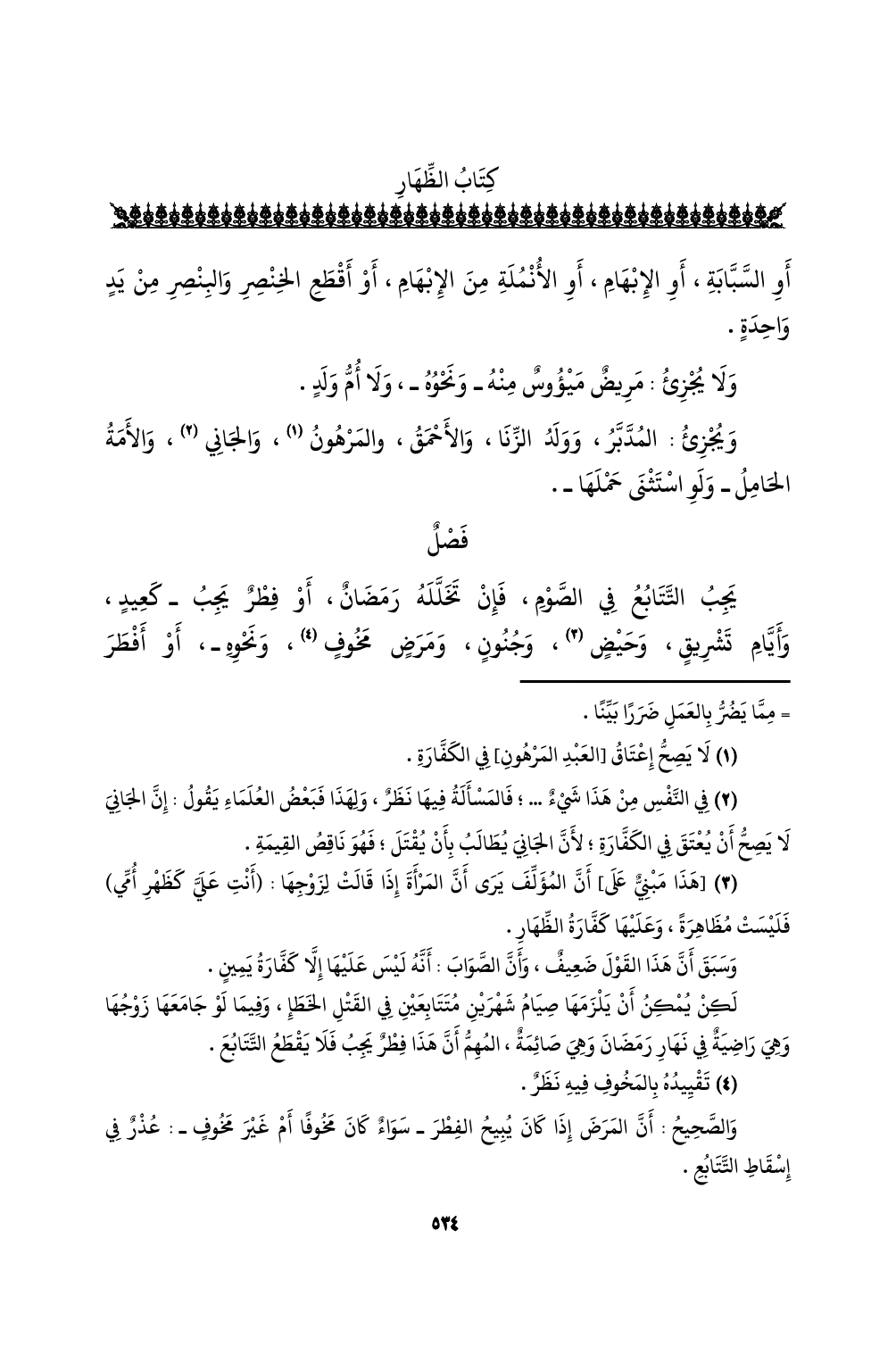 (¬3) [هذا مبني على] أن المؤلف يرى أن المرأة إذا قالت لزوجها: (أنت علي كظهر أمي) فليست مظاهرةً، وعليها كفارة الظهار.