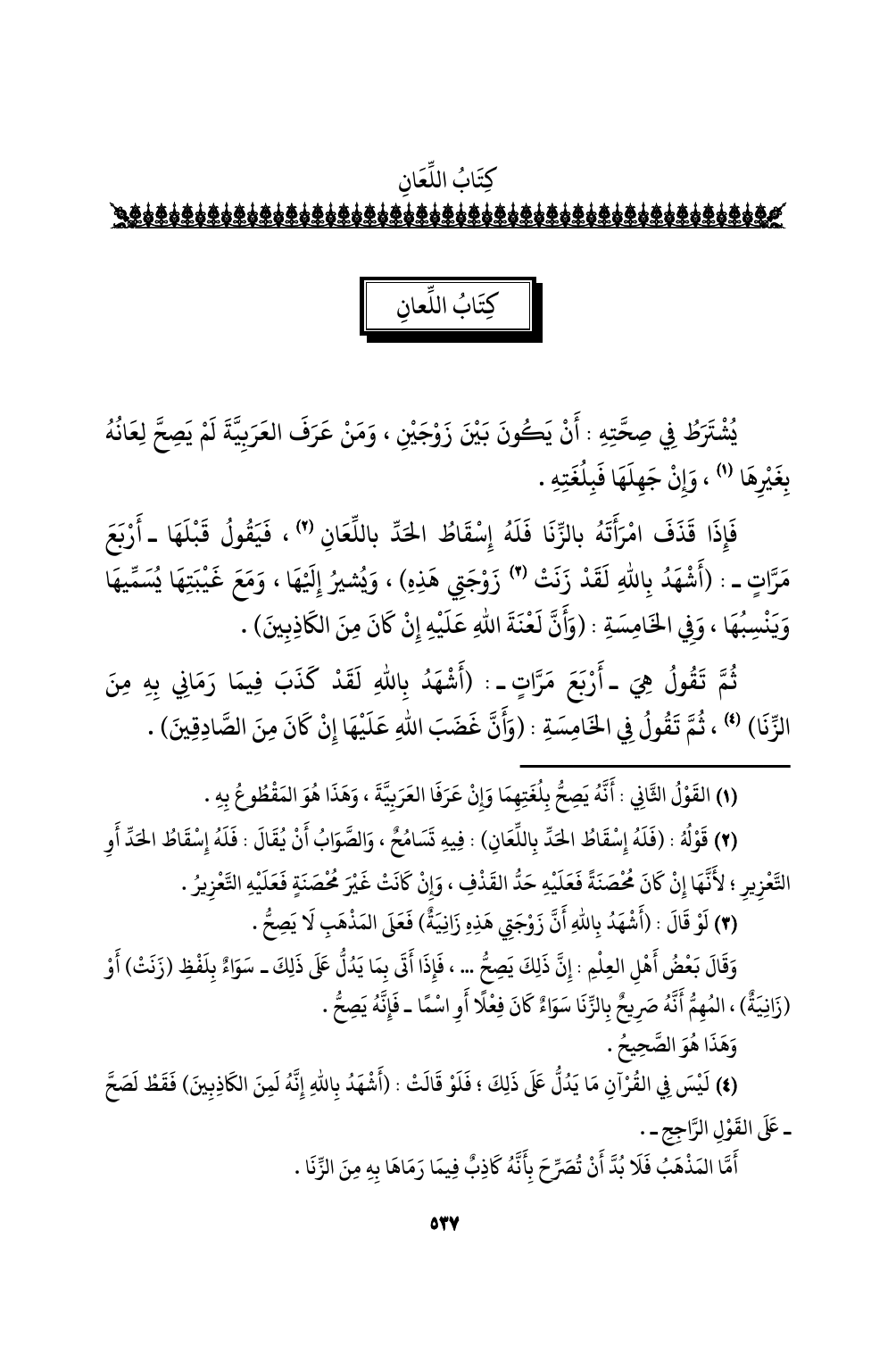 فإذا قذف امرأته بالزنا فله إسقاط الحد باللعان (¬2)، فيقول قبلها - أربع مراتٍ -: (أشهد بالله لقد زنت (¬3) زوجتي هذه)، ويشير إليها، ومع غيبتها يسميها وينسبها، وفي الخامسة: (وأن لعنة الله عليه إن كان من الكاذبين).