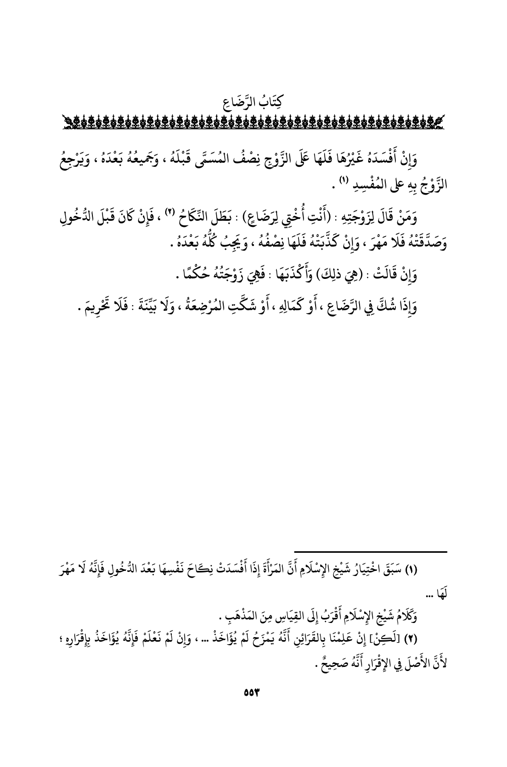 (¬1) سبق اختيار شيخ الإسلام أن المرأة إذا أفسدت نكاح نفسها بعد الدخول فإنه لا مهر لها ...