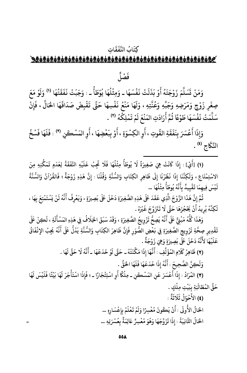 (¬1) [أي]: إذا كانت هي صغيرةً لا يوطأ مثلها فلا تجب عليه النفقة لعدم تمكنه من الاستمتاع، ولكننا إذا نظرنا إلى ظاهر الكتاب والسنة وقلنا: إن هذه زوجةٌ؛ فالقرآن والسنة ليس فيهما تقييدٌ بأنه يوطأ مثلها ...