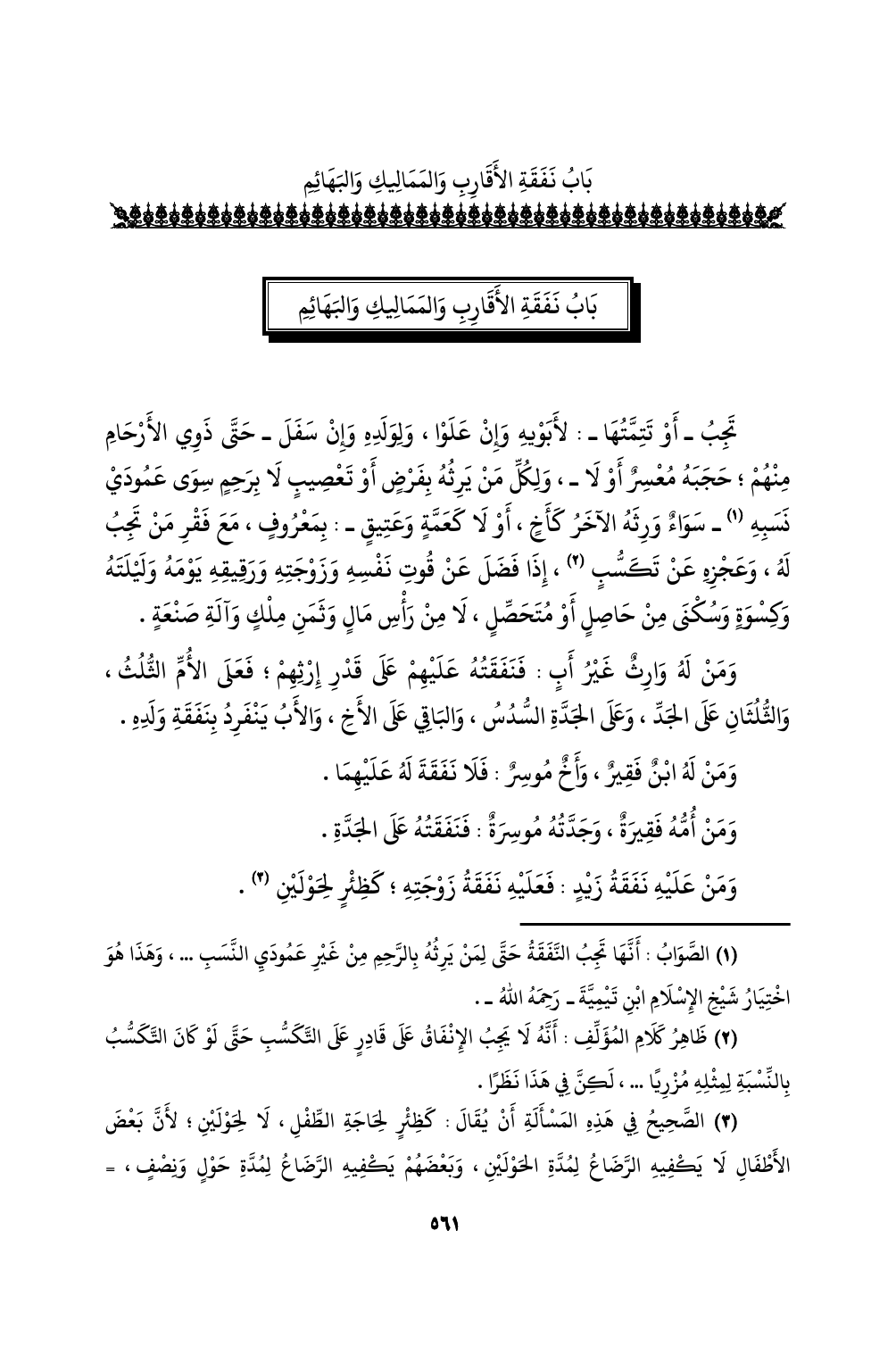 (¬1) الصواب: أنها تجب النفقة حتى لمن يرثه بالرحم من غير عمودي النسب ... ، وهذا هو اختيار شيخ الإسلام ابن تيمية - رحمه الله -.