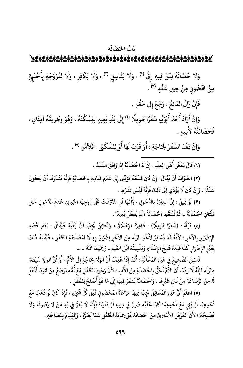 (¬2) الصواب أن يقال: إن كان فسقه يؤدي إلى عدم قيامه بالحضانة فإنه يشترط أن يكون عدلًا، وإن كان لا يؤدي إلى ذلك فإنه ليس بشرطٍ.