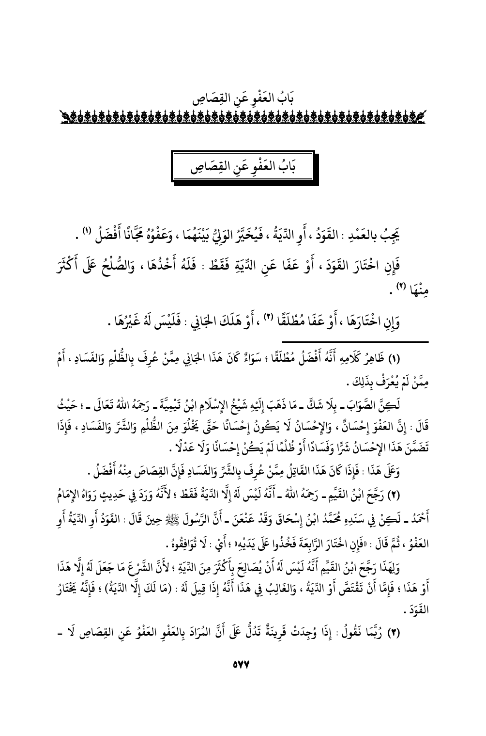 لكن الصواب - بلا شك - ما ذهب إليه شيخ الإسلام ابن تيمية - رحمه الله تعالى -؛ حيث قال: إن العفو إحسانٌ، والإحسان لا يكون إحسانًا حتى يخلو من الظلم والشر والفساد، فإذا تضمن هذا الإحسان شرا وفسادًا أو ظلمًا لم يكن إحسانًا ولا عدلًا.