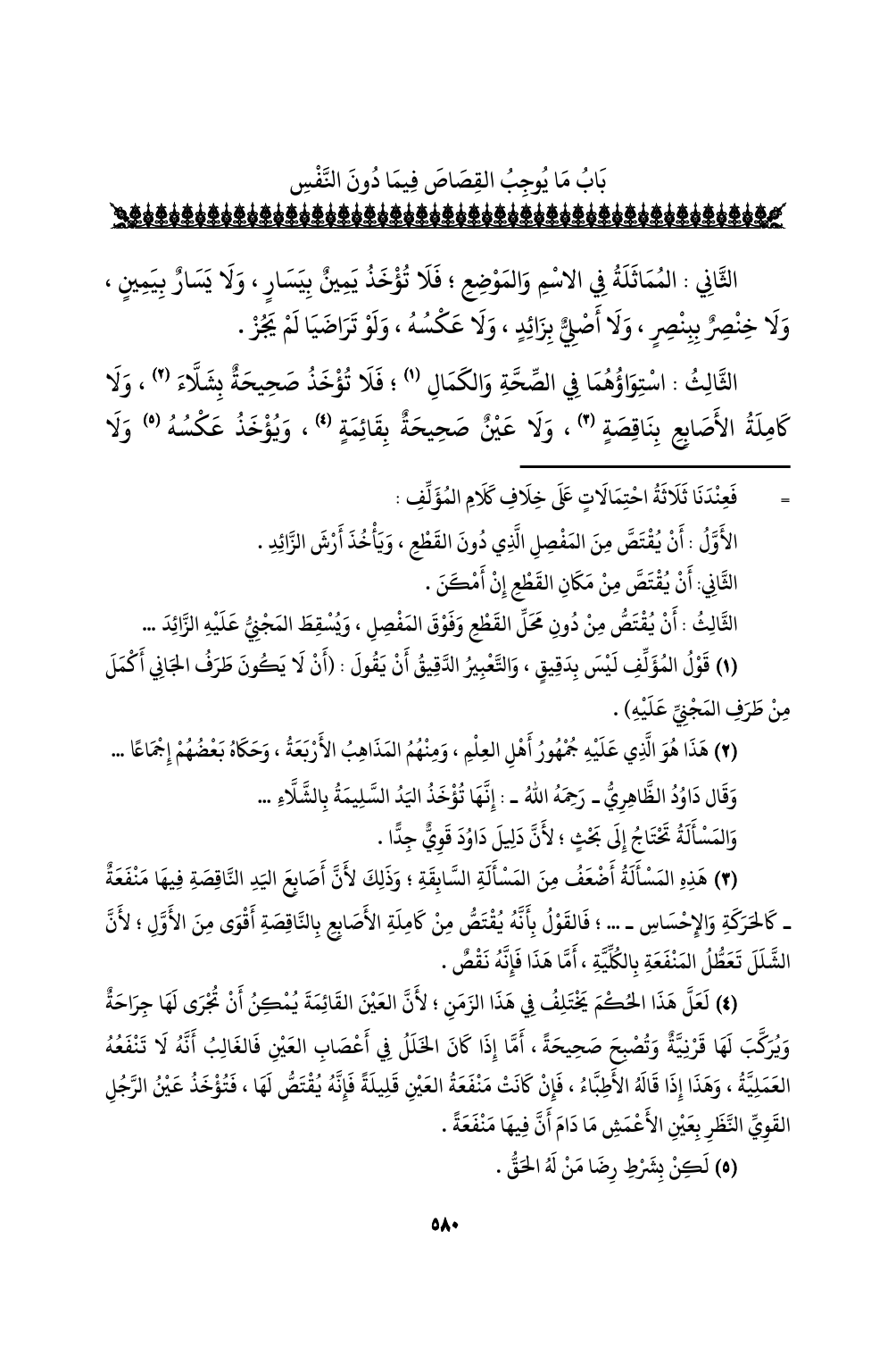 (¬3) هذه المسألة أضعف من المسألة السابقة؛ وذلك لأن أصابع اليد الناقصة فيها منفعةٌ - كالحركة والإحساس - ... ؛ فالقول بأنه يقتص من كاملة الأصابع بالناقصة أقوى من الأول؛ لأن الشلل تعطل المنفعة بالكلية، أما هذا فإنه نقصٌ.