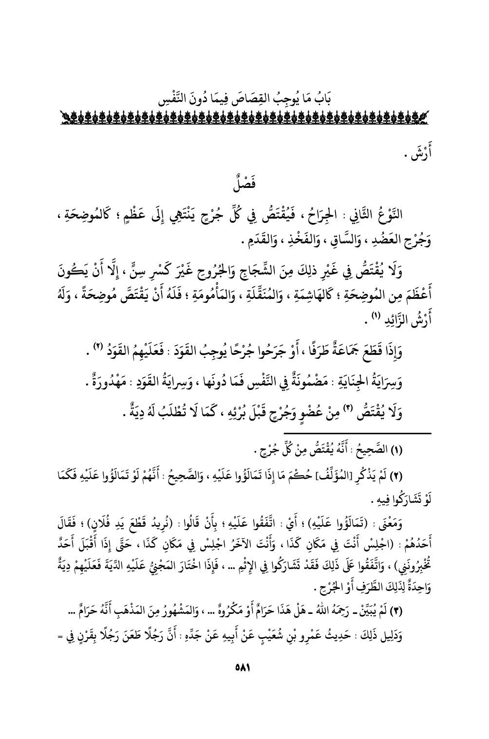 النوع الثاني: الجراح، فيقتص في كل جرحٍ ينتهي إلى عظمٍ؛ كالموضحة، وجرح العضد، والساق، والفخذ، والقدم.
