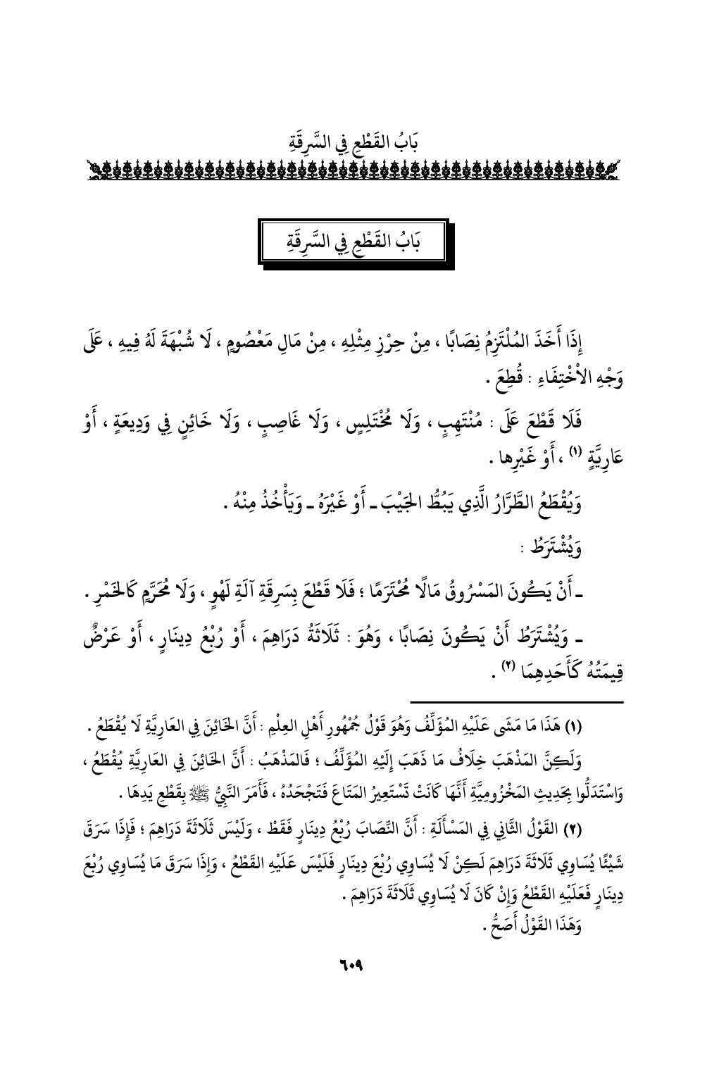 إذا أخذ الملتزم نصابًا، من حرز مثله، من مال معصومٍ، لا شبهة له فيه، على وجه الاختفاء: قطع.
