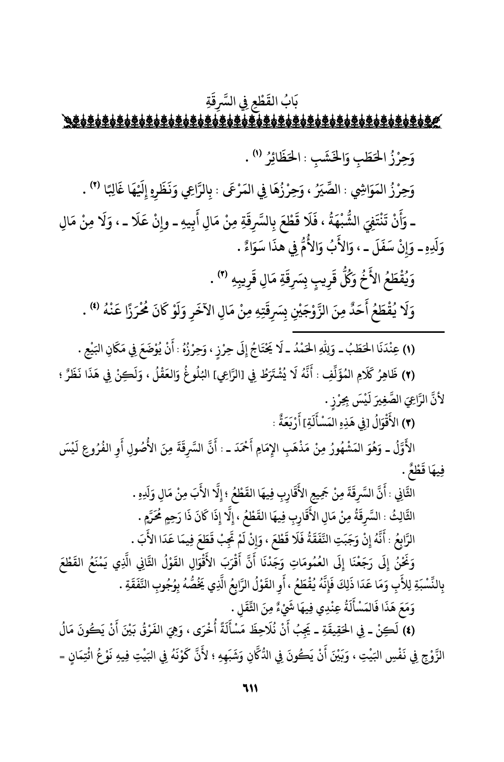 - وأن تنتفي الشبهة، فلا قطع بالسرقة من مال أبيه - وإن علا -، ولا من مال ولده - وإن سفل -، والأب والأم في هذا سواءٌ.