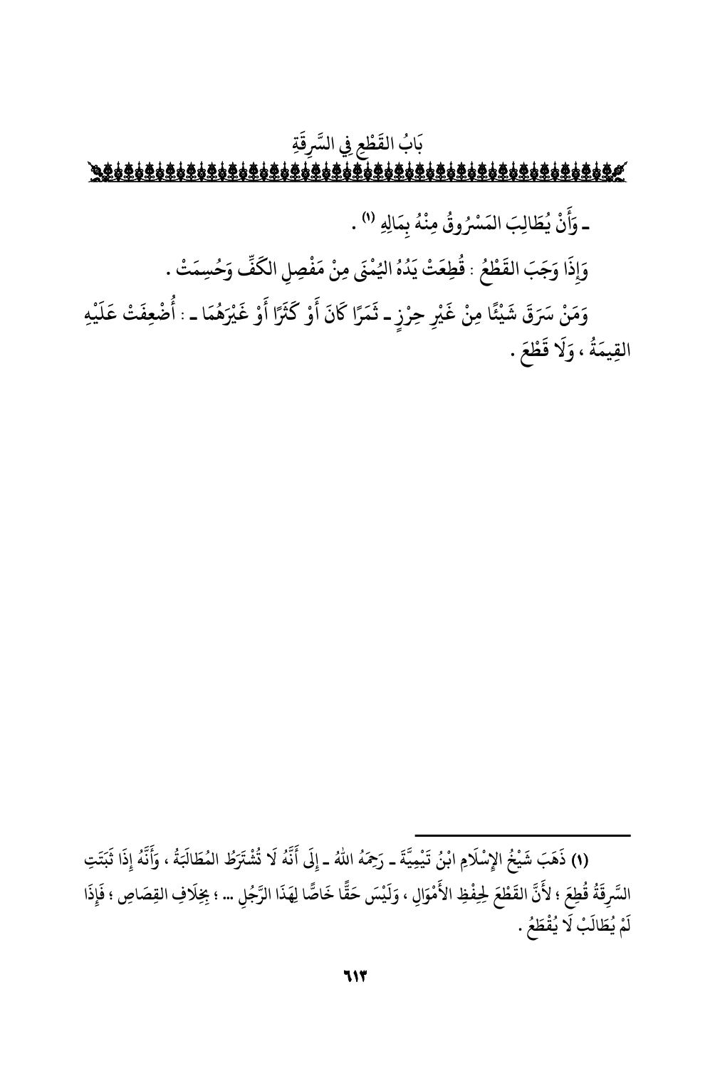 (¬1) ذهب شيخ الإسلام ابن تيمية - رحمه الله - إلى أنه لا تشترط المطالبة، وأنه إذا ثبتت السرقة قطع؛ لأن القطع لحفظ الأموال، وليس حقا خاصا لهذا الرجل ... ؛ بخلاف القصاص؛ فإذا لم يطالب لا يقطع.
