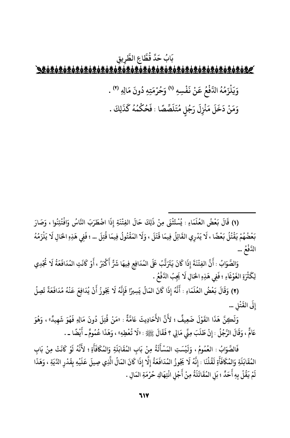 (¬2) وقال بعض العلماء: أنه إذا كان المال يسيرًا فإنه لا يجوز أن يدافع عنه مدافعةً تصل إلى القتل ...