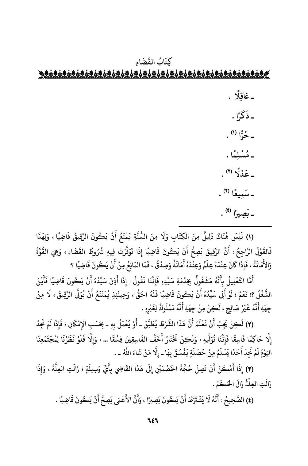 (¬1) ليس هناك دليلٌ من الكتاب ولا من السنة يمنع أن يكون الرقيق قاضيًا، ولهذا